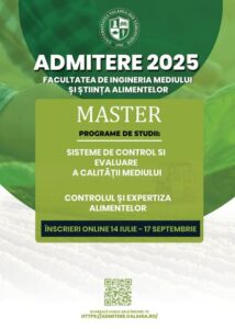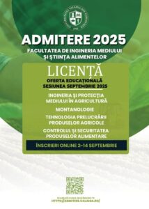 Facultatea de Ingineria Mediului și Știința Alimentelor, din cadrul Universității „Valahia” din Târgoviște organizează o nouă sesiune de admitere pentru anul universitar 2025-2026, oferind încă o oportunitate de înscriere pentru candidații care doresc să urmeze programele de studii universitare de licență și masterat.