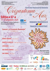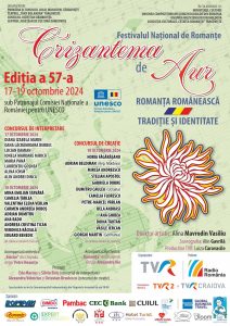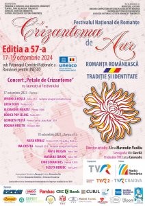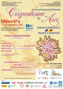 Vă facem cunoscut că, în perioada 17-19 octombrie 2024, se va desfăşura în municipiul Târgovişte, sub patronajul Comisiei Naţionale a României pentru UNESCO, cea de-a 57-a ediţie a Festivalului Naţional de Interpretare şi Creaţie a Romanţei „Crizantema de Aur”, cel mai longeviv festival muzical din România, organizat neîntrerupt din anul 1968 la Târgoviște, cu scopul promovării Romanței – gen muzical de patrimoniu al culturii naţionale.