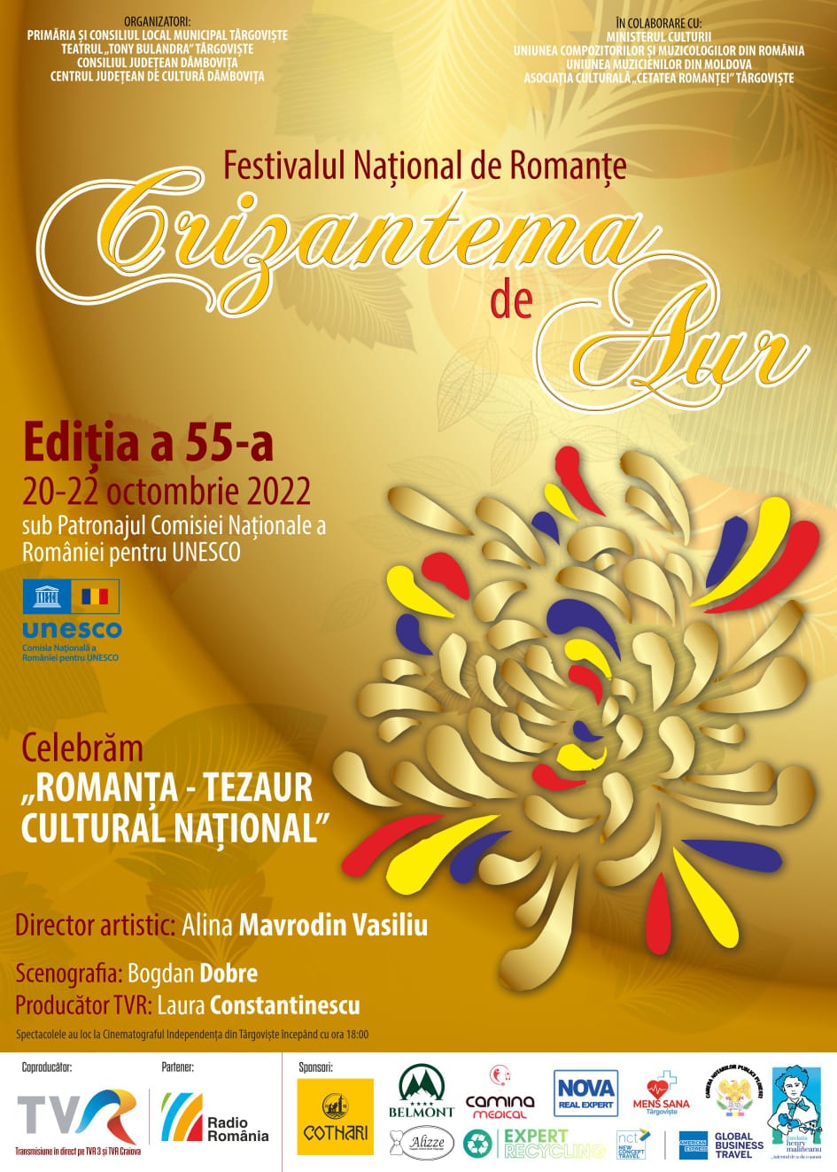 În perioada 20-22 octombrie a.c., se va desfăşura în municipiul Târgovişte, sub patronajul Comisiei Naţionale a României pentru UNESCO, cea de-a 55-a ediţie a Festivalului Naţional de Interpretare şi Creaţie a Romanţei „Crizantema de aur”, cel mai longeviv festival muzical din România, organizat neîntrerupt din anul 1968, tema din acest an fiind : „ROMANȚA – TEZAUR CULTURAL NAȚIONAL”