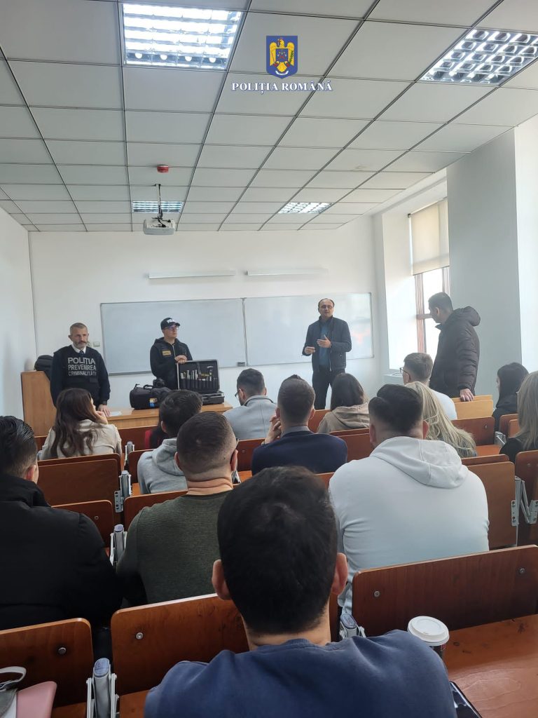Pe lângă sesiunea practică, polițiștii au dezbătut cu studenții subiecte referitoare la legislația în vigoare, fiind expuse în special măsurile de protecție la care pot apela victimele unor infracțiuni de violență.