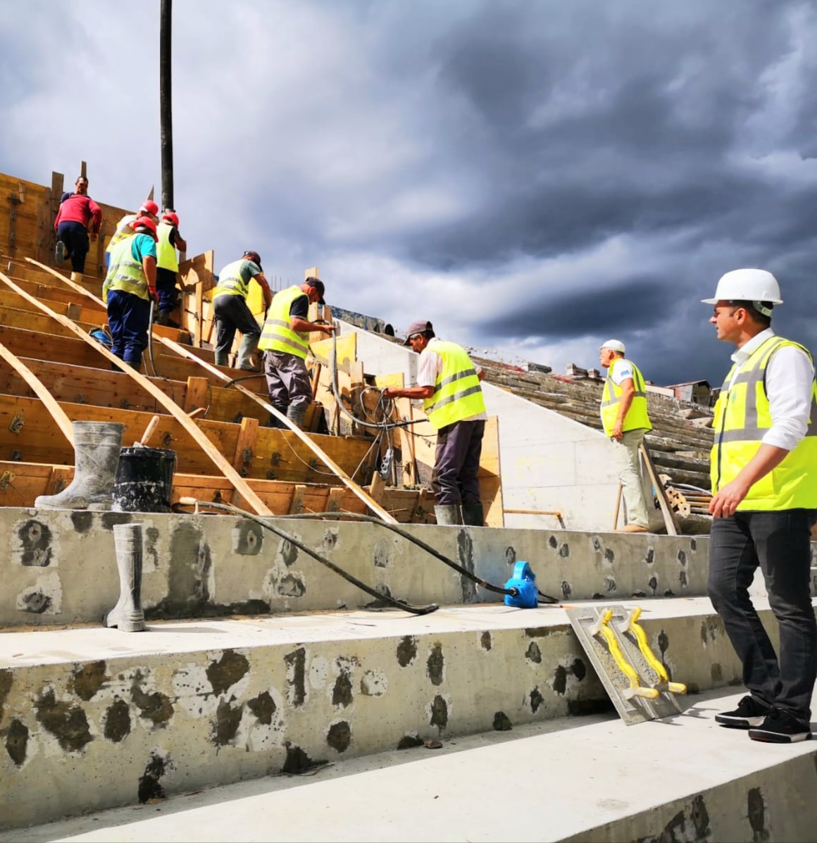 Se lucrează în continuare la tribuna veche pe toate fronturile, atât la încăperile de sub tribună, cât și la exterior, iar ultimele componente ale tribunei metalice se montează în aceste zile. În plus, se lucrează deja la gradenele prefabricate din zona de tribună care va fi rezervată oaspeților, se realizează rețeaua de alimentare cu energie electrică a instalației de degivrare și a nocturnei, se execută hidroizolația la tribuna veche.