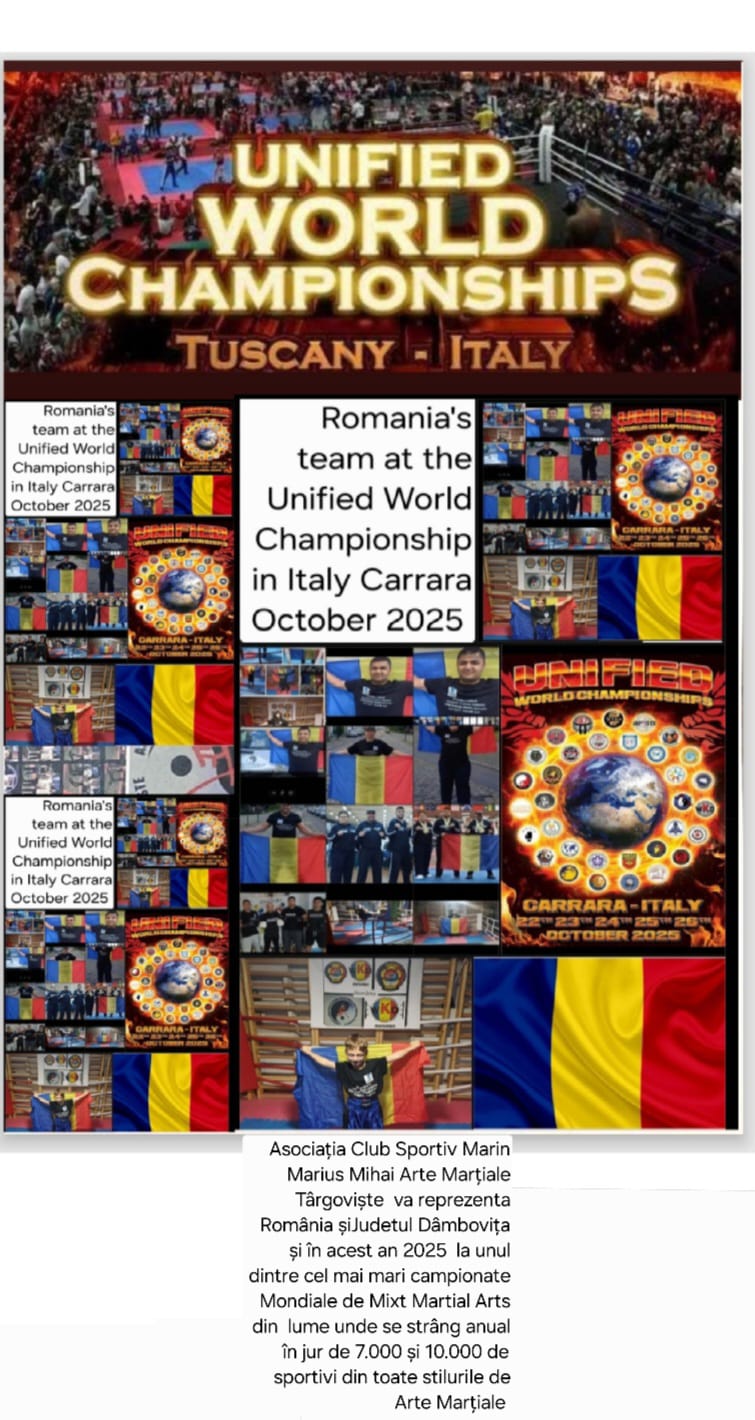 Asociația Club Sportiv Marin Marius Mihai Arte Marțiale Târgoviște va reprezenta România și județul Dâmbovița la Unified World Championship, unul dintre cele mai mari campionate mondiale de arte marțiale mixte, ce va avea loc în octombrie 2025, la Carrara, Italia.