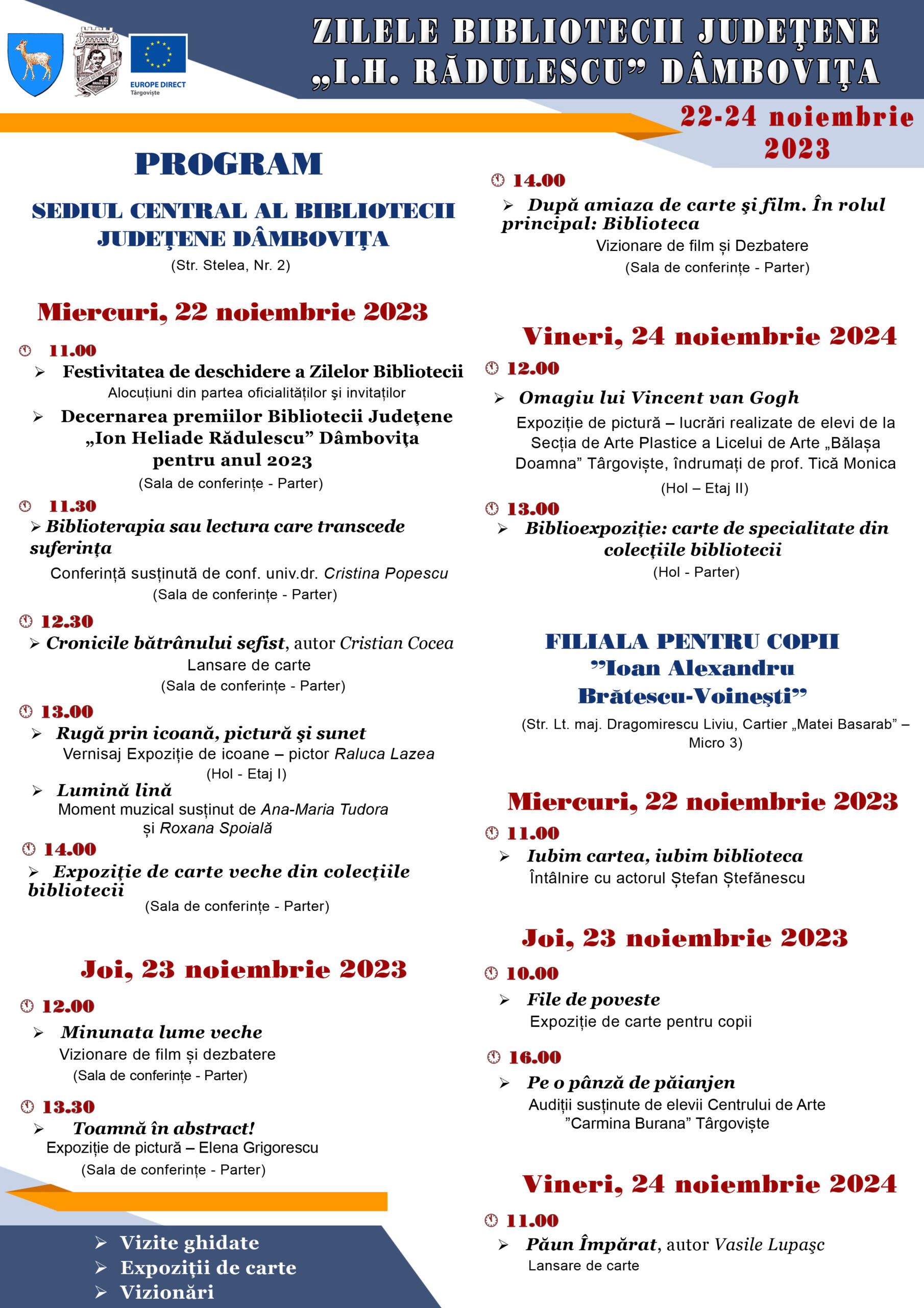 Festivitatea de deschidere va avea loc miercuri, 22 noiembrie 2023, începând cu orele 11.00, la sediul Bibliotecii Județene Dâmbovița (Str. Stelea, Nr.2) – Sala de Conferințe.