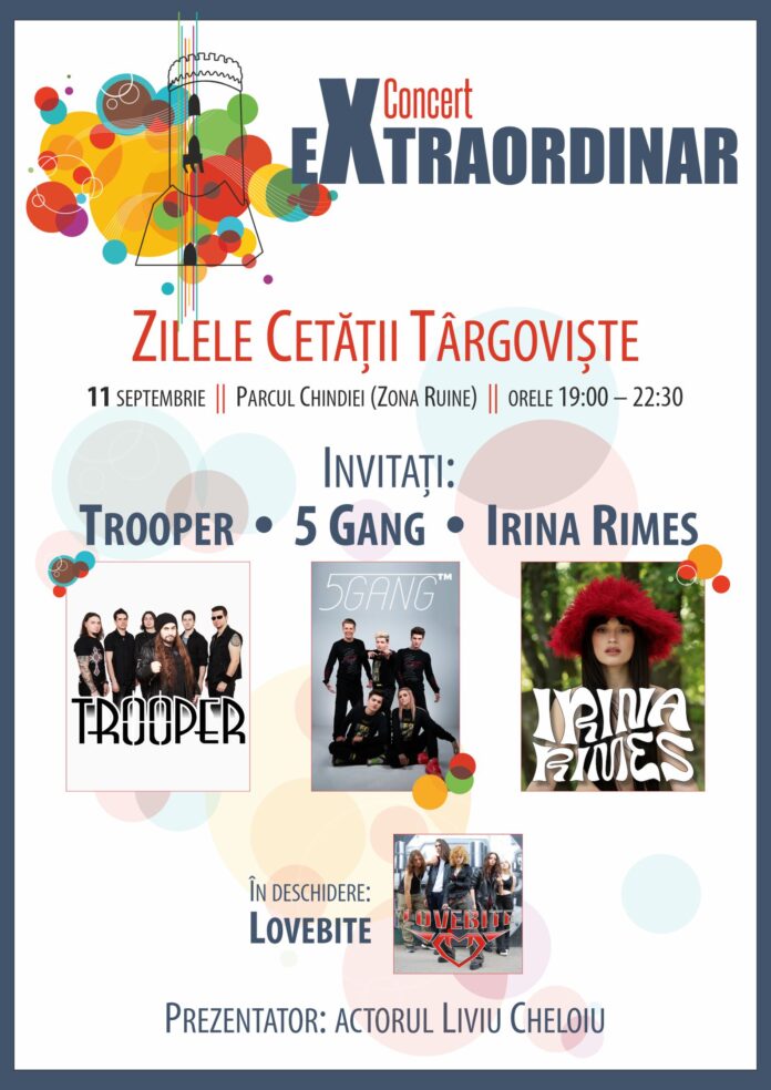19:00 – 22:30 – Concert extraordinar Zilele Cetății Târgoviște – Invitați: Lovebite Rock, Trooper, 5 Gang, Irina Rimes. Prezentator: actorul Liviu Cheloiu